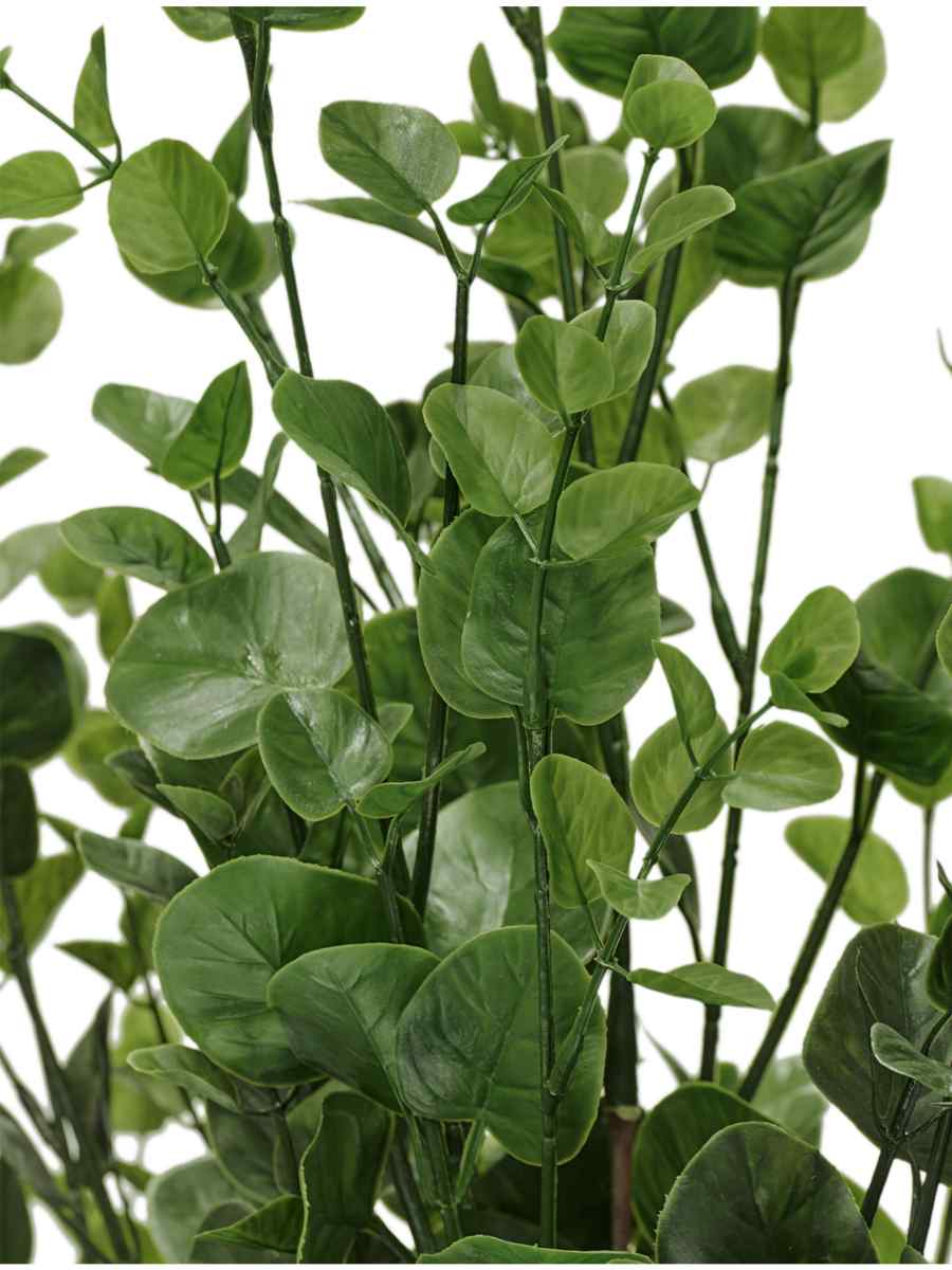 Эвкалипт выполнен из высокотехнологичного пластика с металлическим каркасом, благодаря чему его форма и фактура выглядят максимально реалистично. Листва окрашена в натуральный зелёный оттенок, который не тускнеет со временем и сохраняет насыщенность даже при активном освещении. Такое интерьерное растение легко впишется как в современный минимализм, так и в уютную классическую обстановку.