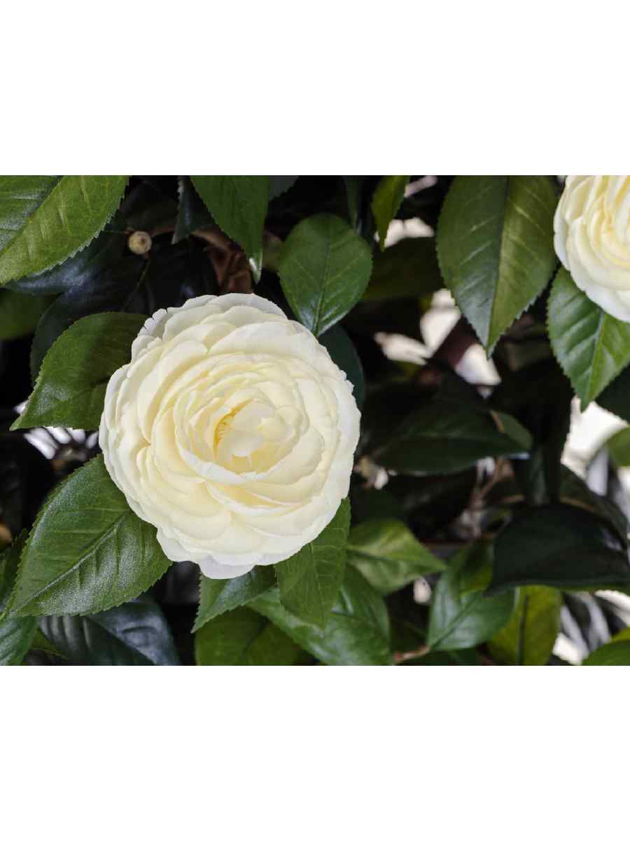 Камелия выглядит максимально естественно: нежные кремовые бутоны гармонично сочетаются с густой листвой, а натуральный деревянный ствол придаёт изделию особую реалистичность. Благодаря использованию высокотехнологичного пластика, полистирола и ткани на основе шёлка каждая деталь проработана до мелочей. Такое декоративное дерево невозможно отличить от настоящего даже при близком рассмотрении.