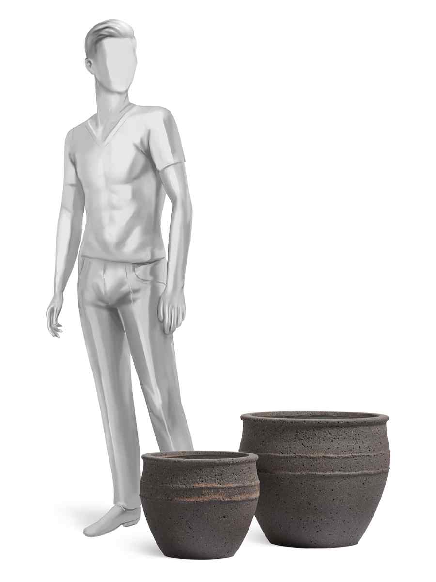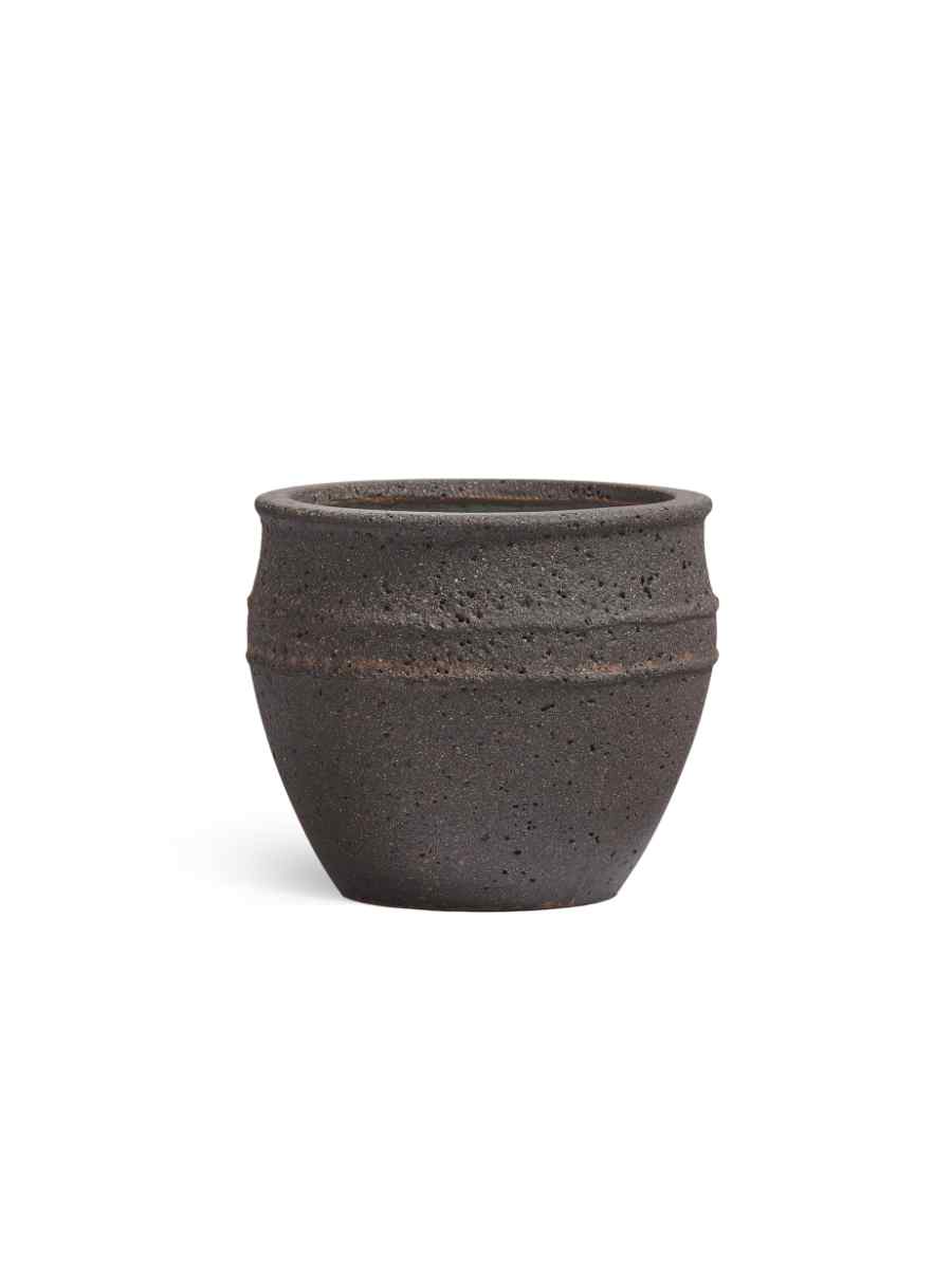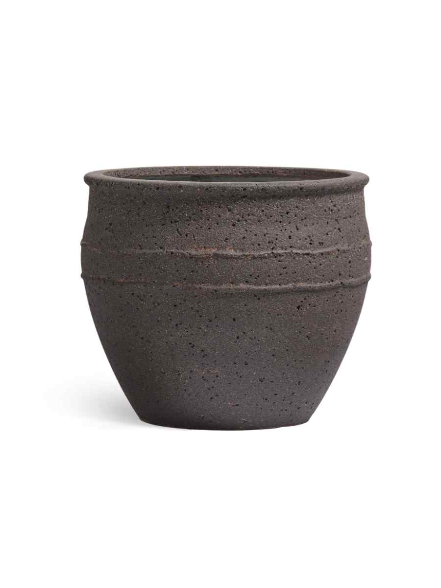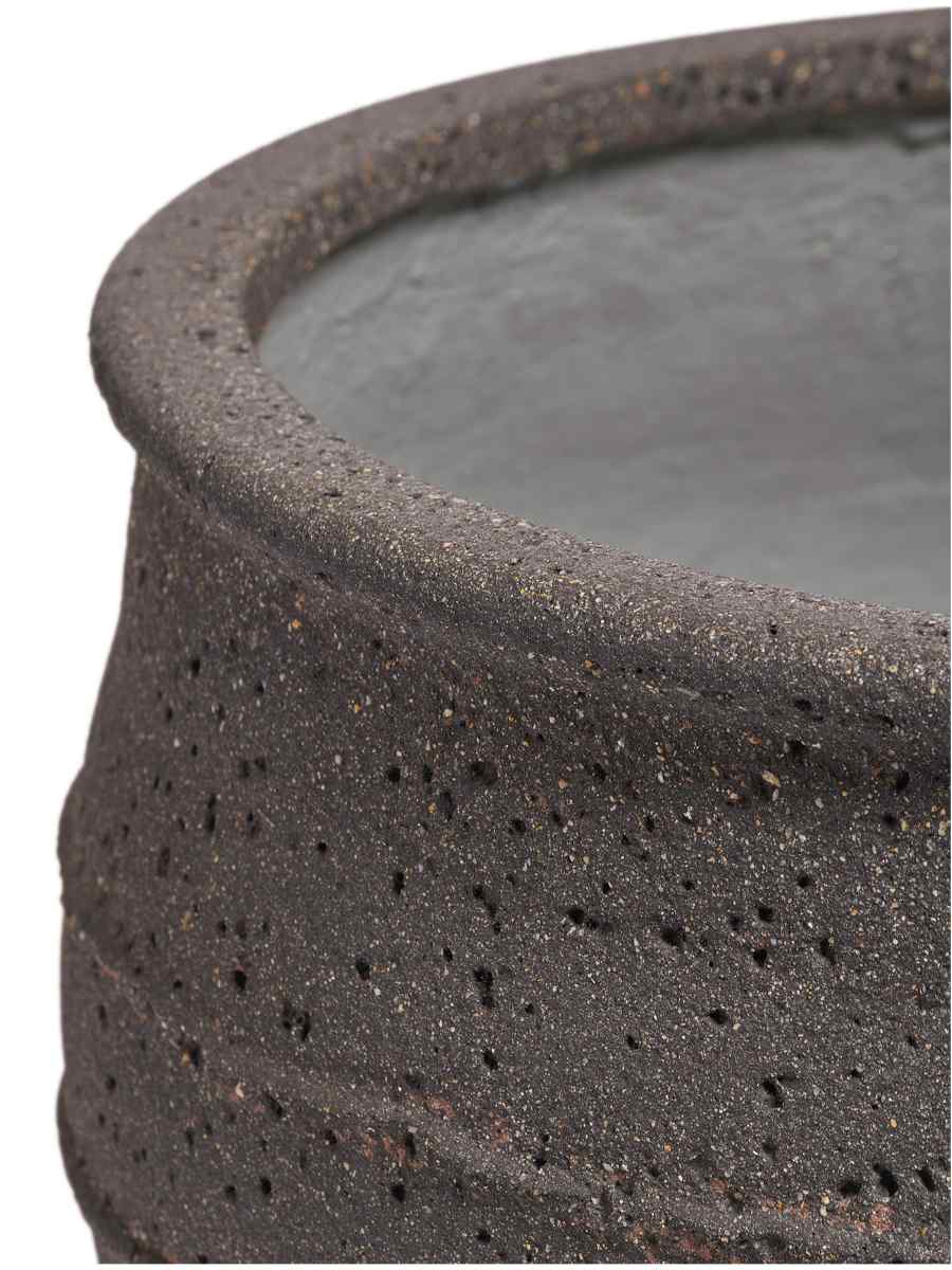 Кашпо выполнено в форме элегантной чаши с глубоким матовым оттенком «чёрный туф». Такая поверхность подчёркивает фактуру материала и гармонично сочетается как с зелёными растениями, так и с яркоцветущими композициями. Лаконичный дизайн делает его универсальным элементом декора: он одинаково хорошо смотрится в классическом интерьере и в современных минималистичных пространствах.