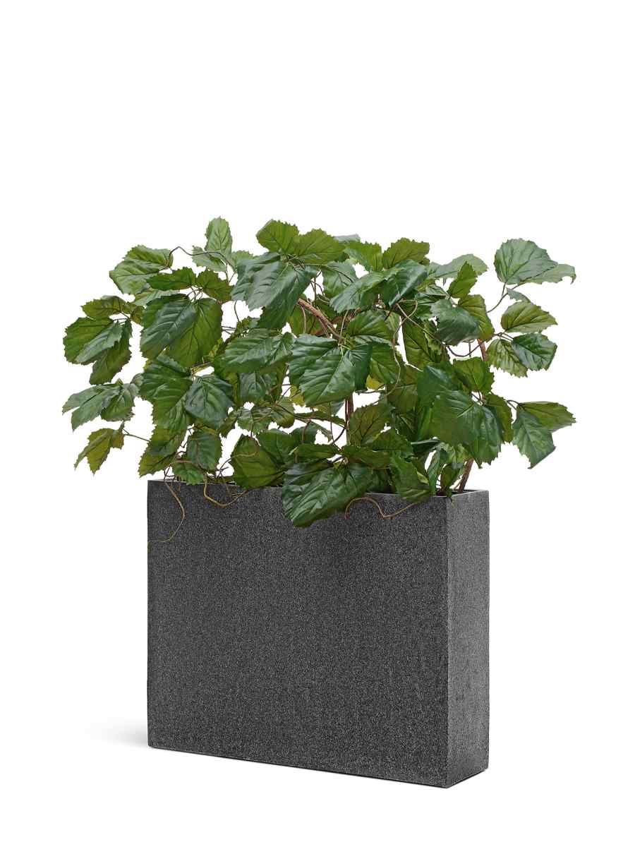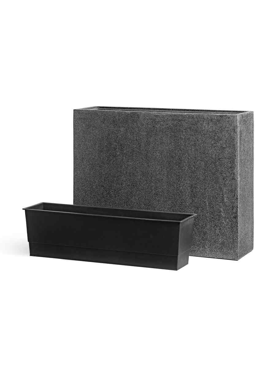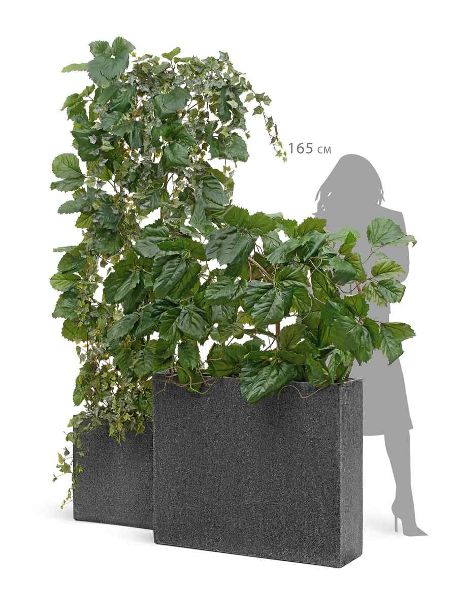Кашпо выполнено в элегантном тёмно-сером оттенке под натуральный камень. Лаконичная форма дивайдера позволяет использовать его не только как вместительный горшок для растений, но и как декоративный элемент зонирования пространства. Благодаря крупным размерам (75×92 см) оно отлично подходит для размещения как одиночных растений, так и целых композиций.