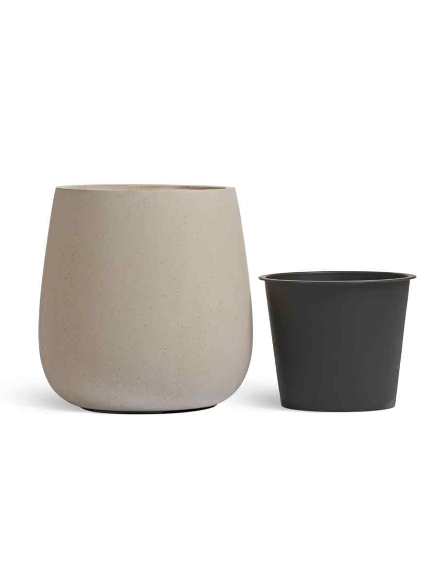Кашпо выполнено из прочной керамики с эффектом бетона. Такая поверхность выглядит минималистично и дорого одновременно. Благодаря нейтральному бело-песочному цвету горшок легко вписывается как в строгий офисный интерьер, так и в уютную домашнюю атмосферу. Он подчеркнет зелень растений и создаст стильный контраст с любым фоном.