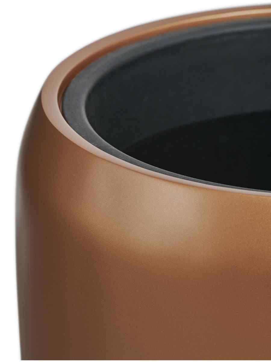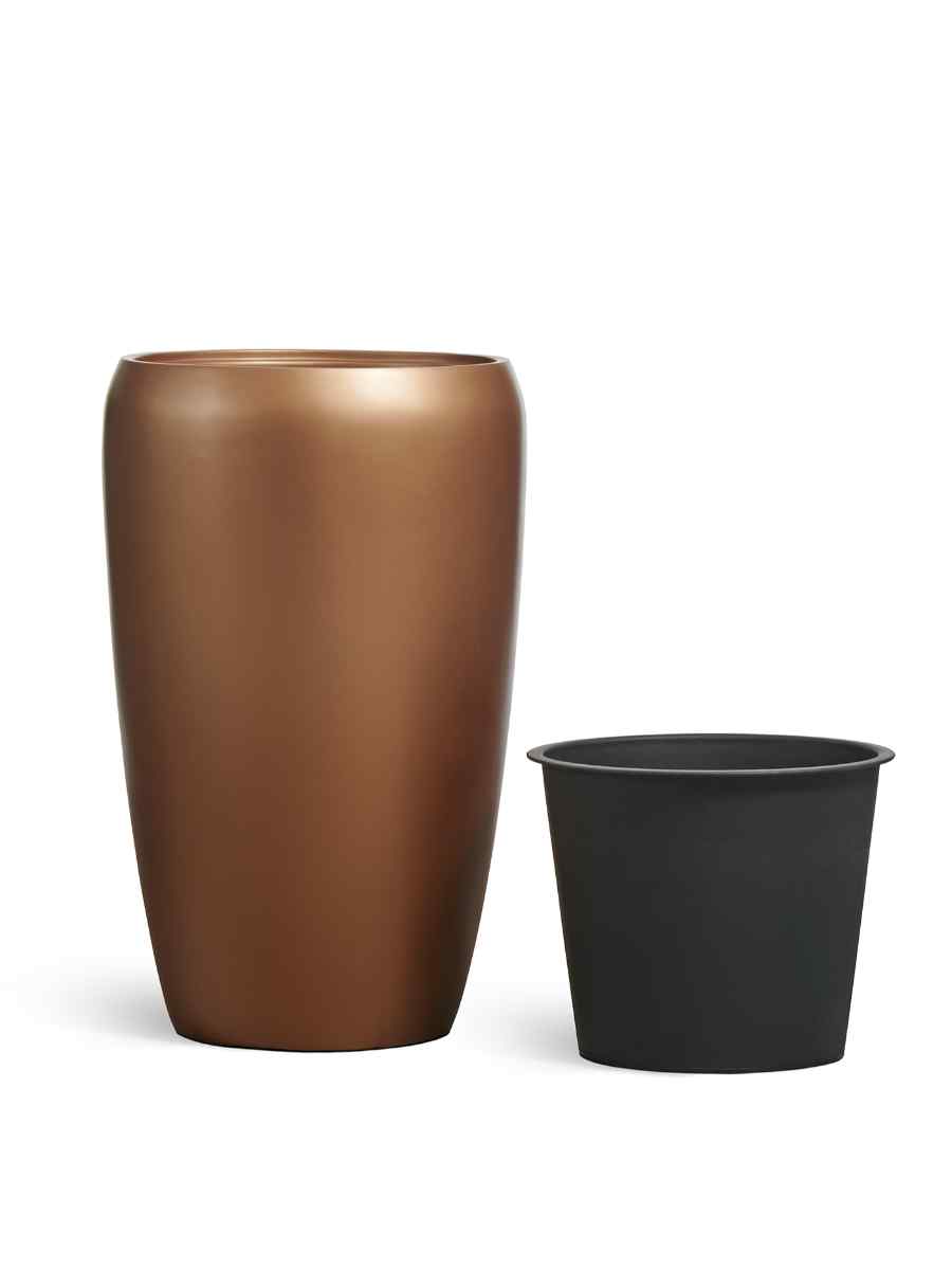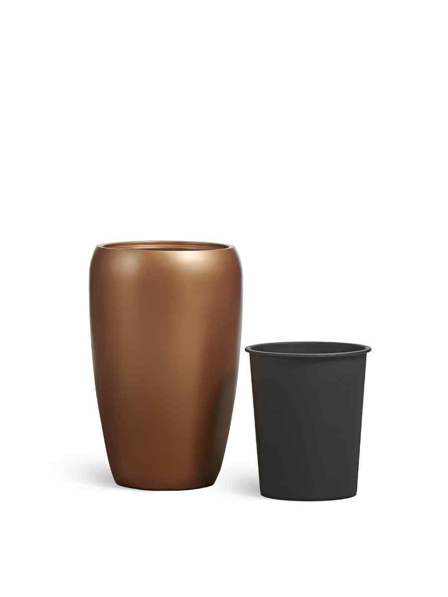 Кашпо выполнено из прочного материала с использованием керамического горшка и металлического корпуса с покрытием «Лаковое тёмное золото». Такой дизайн придаёт изделию премиальный вид: глубокий благородный оттенок золота красиво переливается при свете и создаёт ощущение роскоши. Конусообразная форма визуально вытягивает композицию и делает её более выразительной.