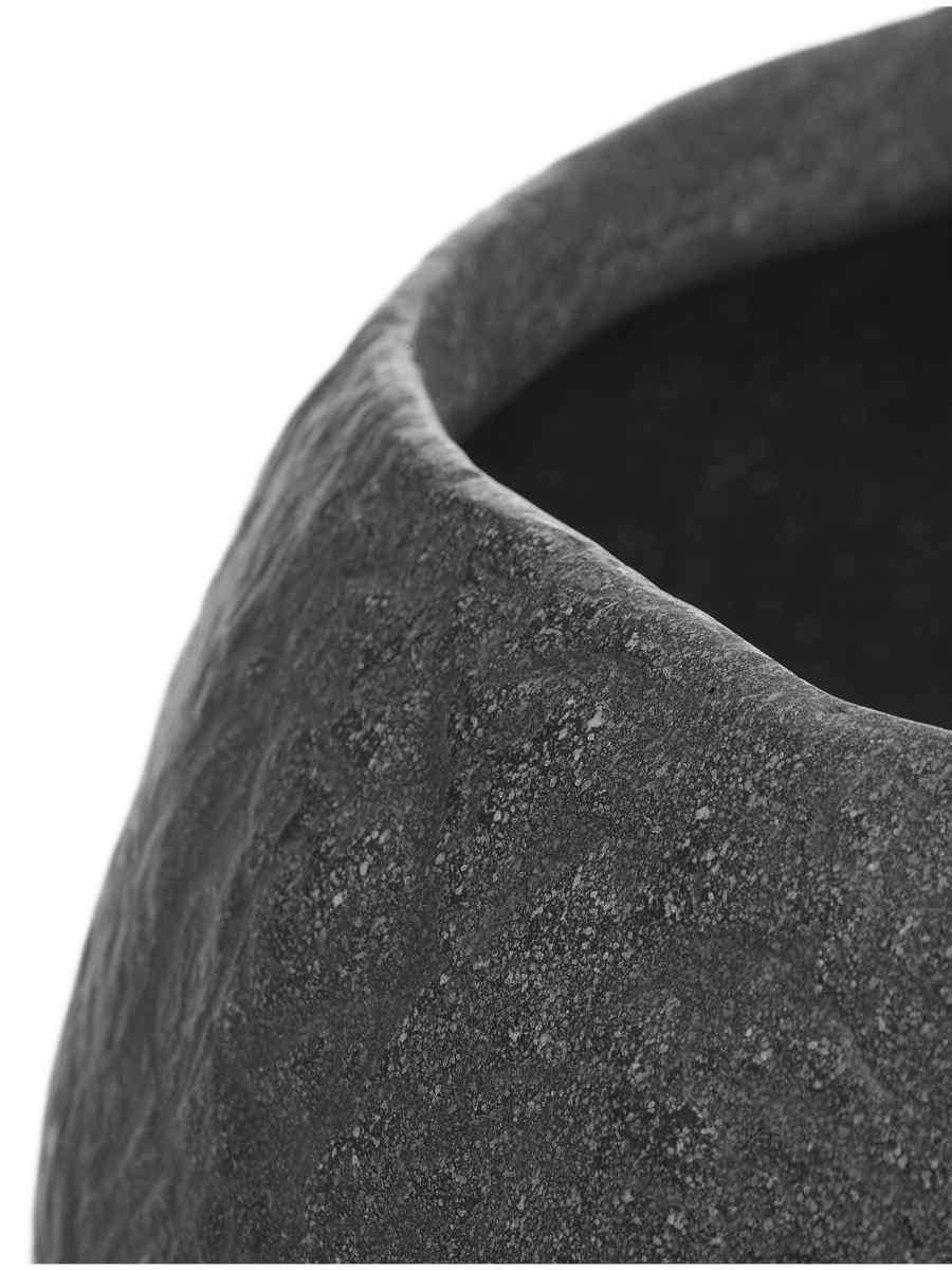 Кашпо выполнено из прочной керамики с фактурой «тёмно-серый камень». Материал выглядит эстетично и натурально, при этом отличается долговечностью. Гладкая округлая форма чаши делает изделие универсальным: оно одинаково хорошо смотрится как с крупными зелёными растениями, так и с цветущими композициями. Благодаря объёму 20 литров можно высаживать даже массивные растения с развитой корневой системой.