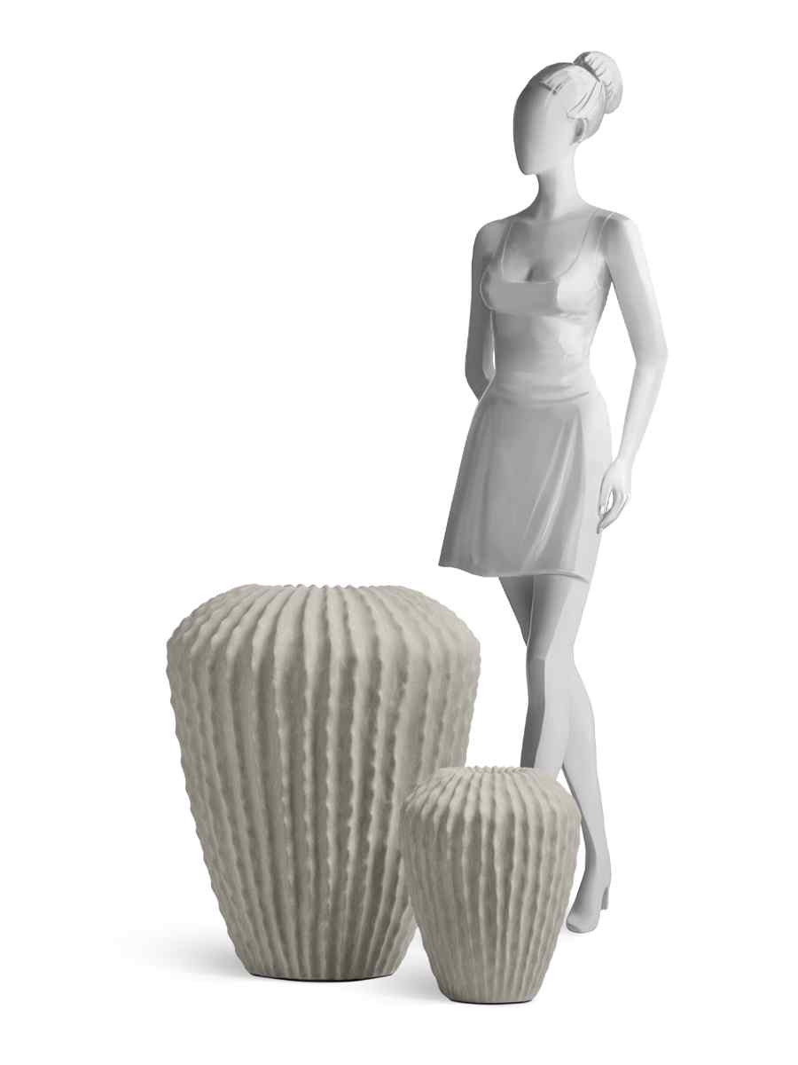 - Напольная форма обеспечивает устойчивость и подчёркивает выразительность зелёных композиций.