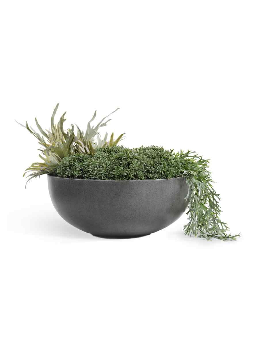 Кашпо выполнено в форме низкой сферической чаши из прочного керамического материала с эффектом тёмно-серого бетона. Такая фактура придаёт изделию солидный и минималистичный вид, а универсальный оттенок легко сочетается с разными стилями оформления — от классики до современного лофта.