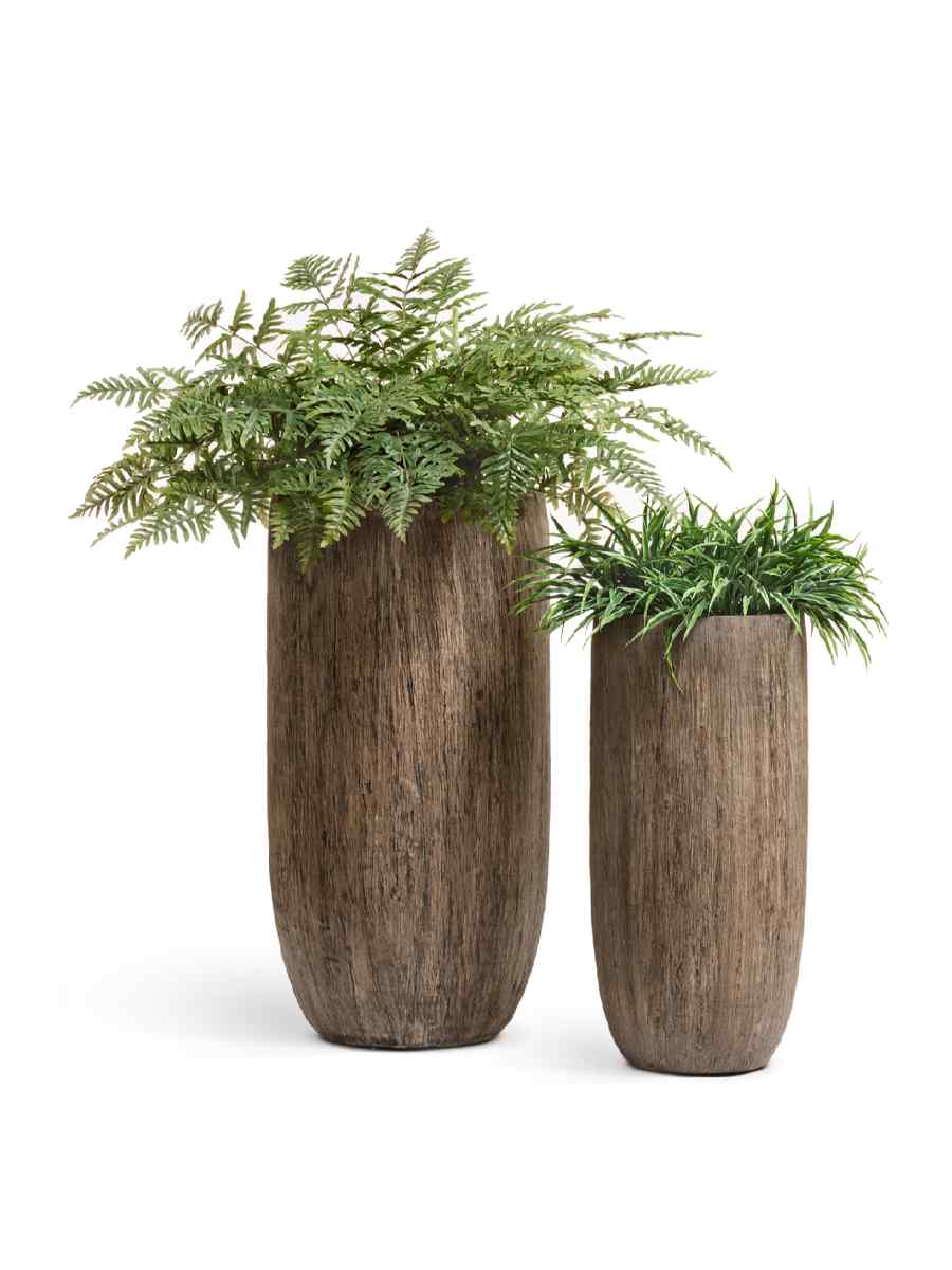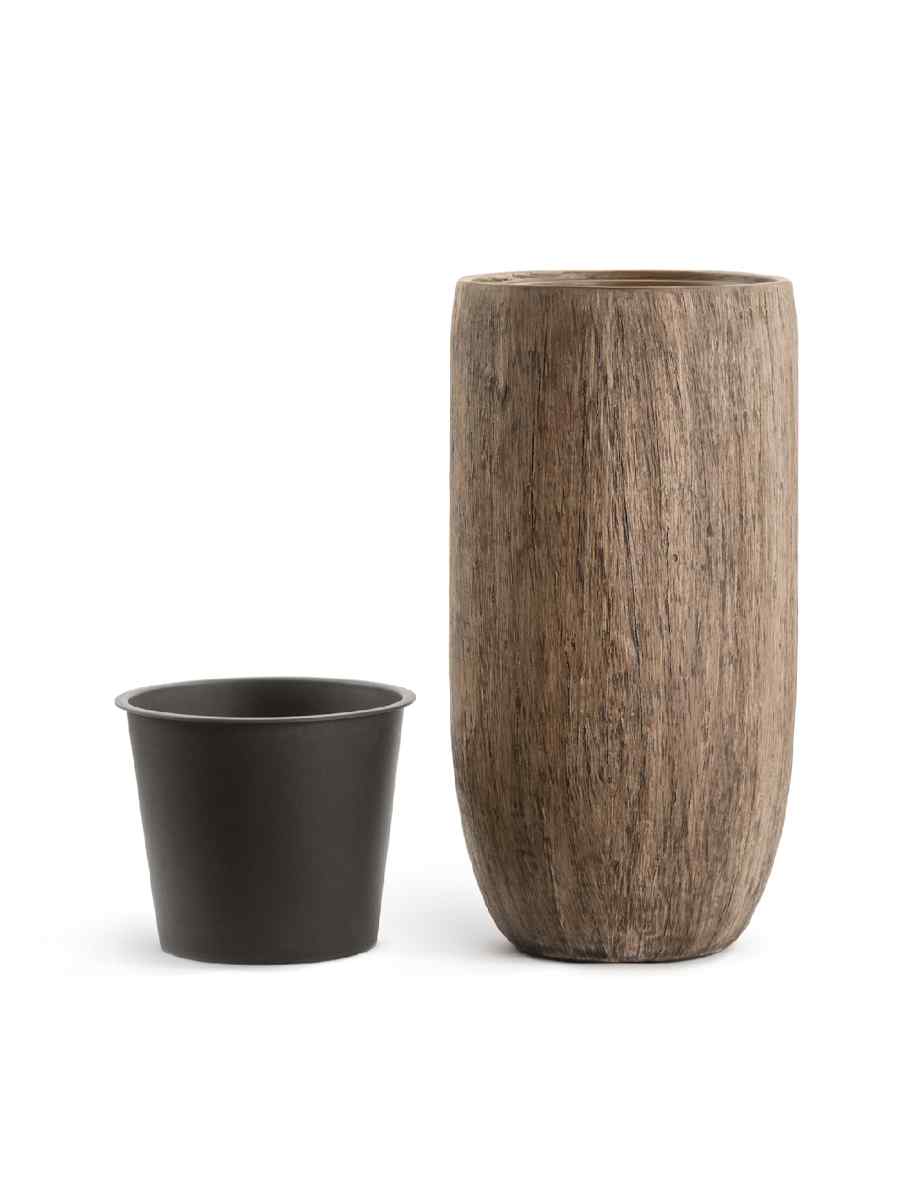 Внешне кашпо напоминает натуральное дерево светлого дуба. Его конусообразная форма делает композицию с растением изящной и визуально вытягивает пространство. Керамический горшок отличается гладкой поверхностью и тщательно проработанной текстурой, что придаёт ему дорогой и эстетичный вид. Такое оформление позволяет легко вписать изделие как в классический интерьер, так и в современный минимализм.