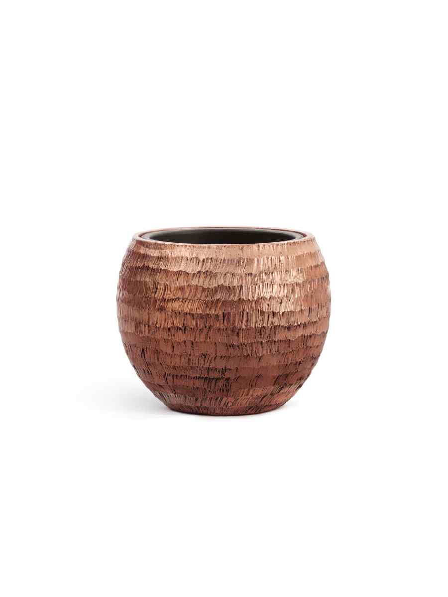 Кашпо выполнено в форме изящной сферы с покрытием под розовую медь. Эффектный металлический блеск придает изделию премиальный вид и делает его не просто функциональным аксессуаром, а полноценным элементом декора. Благодаря лаконичной форме и благородному цвету оно легко сочетается как с классическим интерьером, так и с современными минималистичными решениями.
