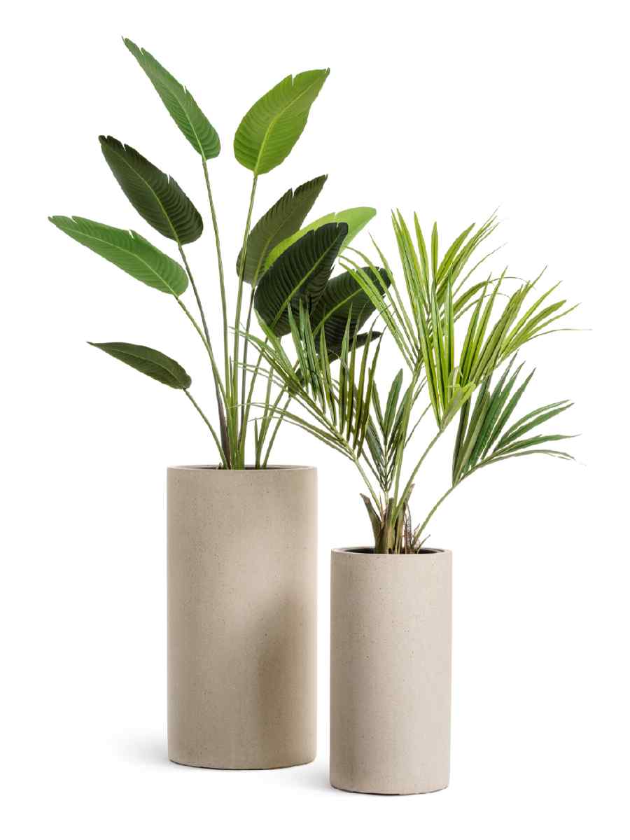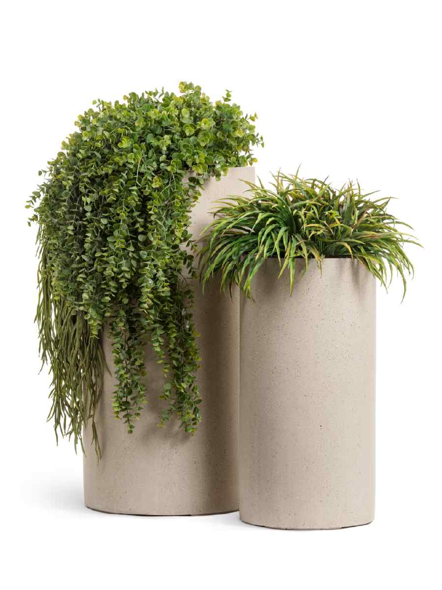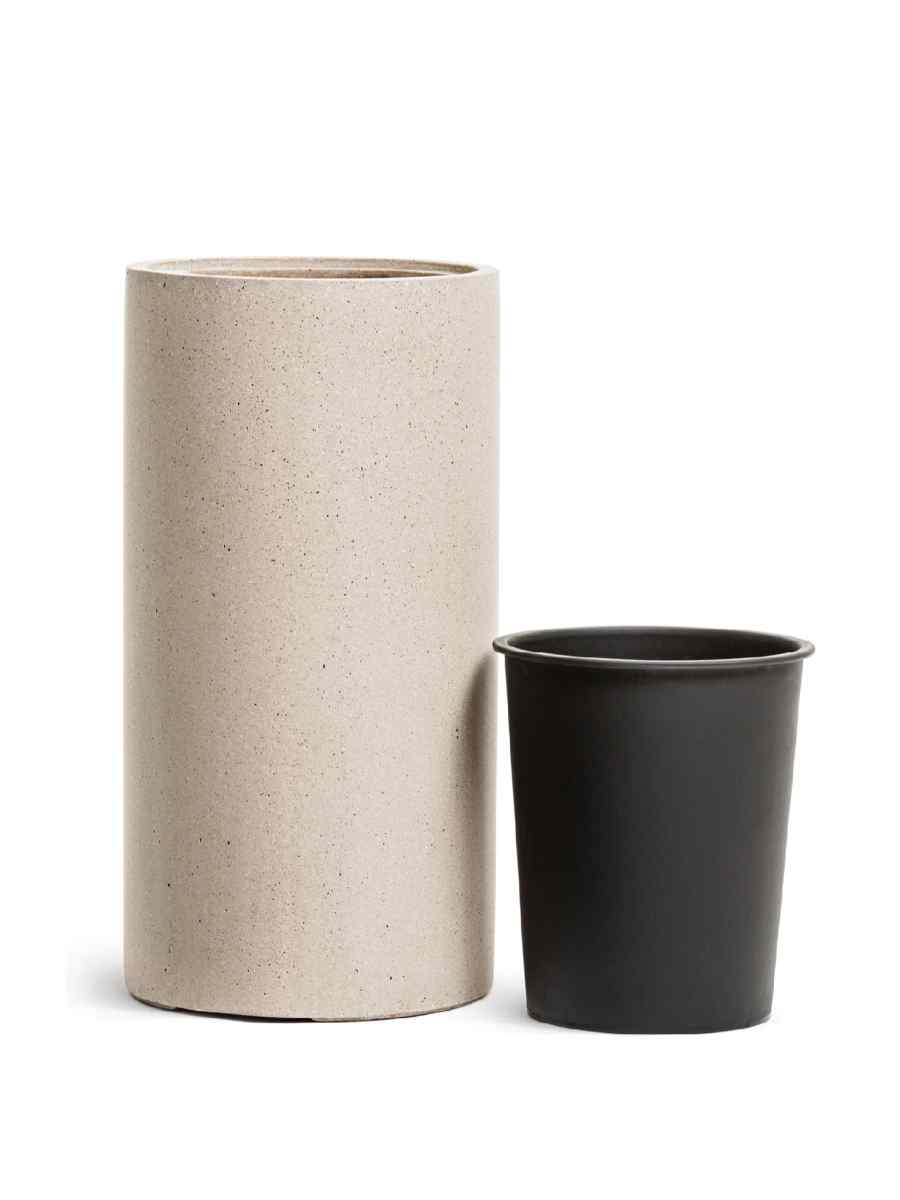 Цилиндрическая форма придаёт изделию современный минималистичный вид, который легко вписывается в разные стили интерьера — от классики до скандинавского и лофта. Матовая поверхность с лёгкой текстурой бетона делает кашпо визуально лёгким, но при этом основательным. Благодаря крупному размеру (60×31 см) и объёму 37 литров оно подходит как для компактных декоративных растений, так и для более крупных композиций.