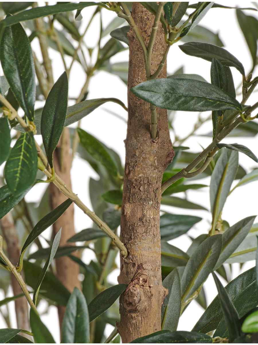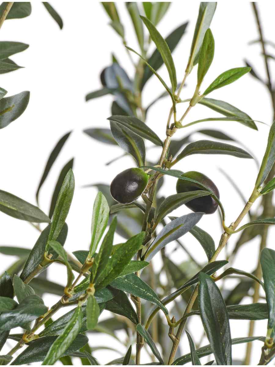 Декоративное дерево выполнено из натурального дерева, полистирола и высокотехнологичного пластика. Благодаря этому его крона выглядит воздушной и естественной, а серо-зелёные листья с матовой текстурой создают ощущение настоящей оливы. Яркие плоды добавляют композиции выразительности и делают растение ещё более правдоподобным.