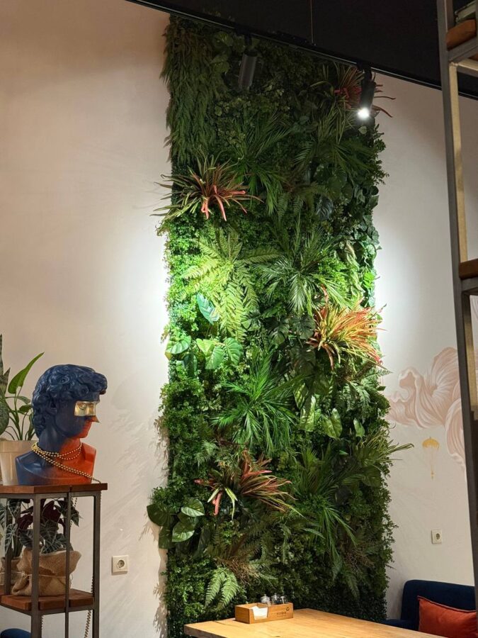 Фитостена — это вертикальная композиция из искусственных или стабилизированных растений, которая украшает пространство, создаёт ощущение природы и служит ярким дизайнерским акцентом.