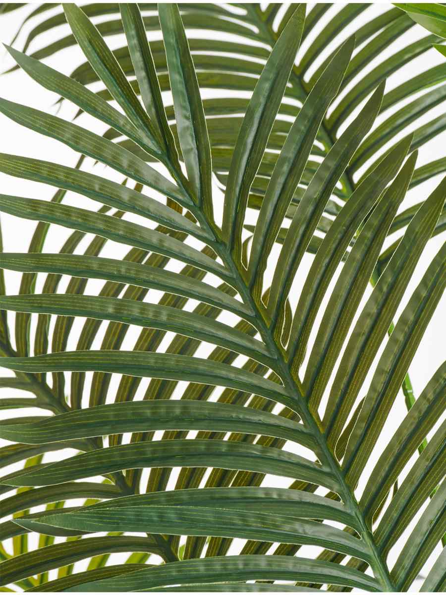 Внешний вид пальмы впечатляет: густая крона из изящных перьевидных листьев выполнена в натуральном зелёном цвете, который не выгорает со временем. Благодаря использованию серии Sensitive Botanic и сочетанию полистирола, высокотехнологичного пластика и вставок из натуральных материалов дерево выглядит живым и реалистичным даже при близком рассмотрении.